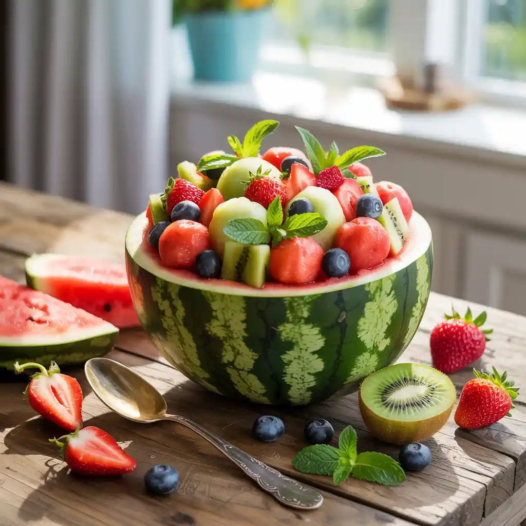 A watermelon fruit bowl is the purest taste of summer—cool, juicy, and bursting with color. Imagine plunging your spoon into the ruby-red flesh of a perfectly ripe watermelon, chilled to perfection, and scooping up sweet bites of strawberries, blueberries, pineapple, and more. Each spoonful is like a tropical vacation, refreshing and full of light, natural sugar that dances on your taste buds. It is the kind of dish that makes you pause and smile, reminding you to slow down and savor the sunshine.
