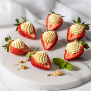 - Garnish with a sprinkle of crushed graham crackers and a small mint leaf on top of each filled strawberry.