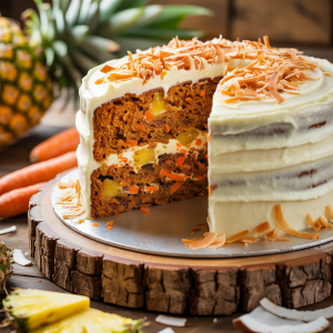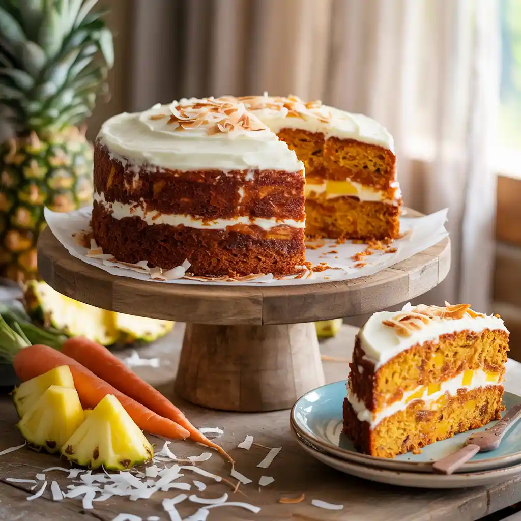 Topped with a silky cream cheese frosting and infused with hints of cinnamon and vanilla, this cake feels like a sweet escape to paradise. The tropical pineapple balances the earthiness of carrots, while the soft crumb and light spice remind you of something lovingly made from scratch for a family gathering. Whether served at a luau-themed backyard dinner or as a showstopper dessert at a holiday table, this cake brings a sense of celebration with every slice.