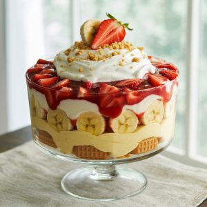 Each silky bite gives you pudding banana cheesecake fluff and strawberry. I often serve it in a trifle bowl or clear dish so everyone can admire the creamy ripples of fruit and cookies. It is one of those desserts that looks like you fussed all day — yet it comes together as easily as stirring and layering.