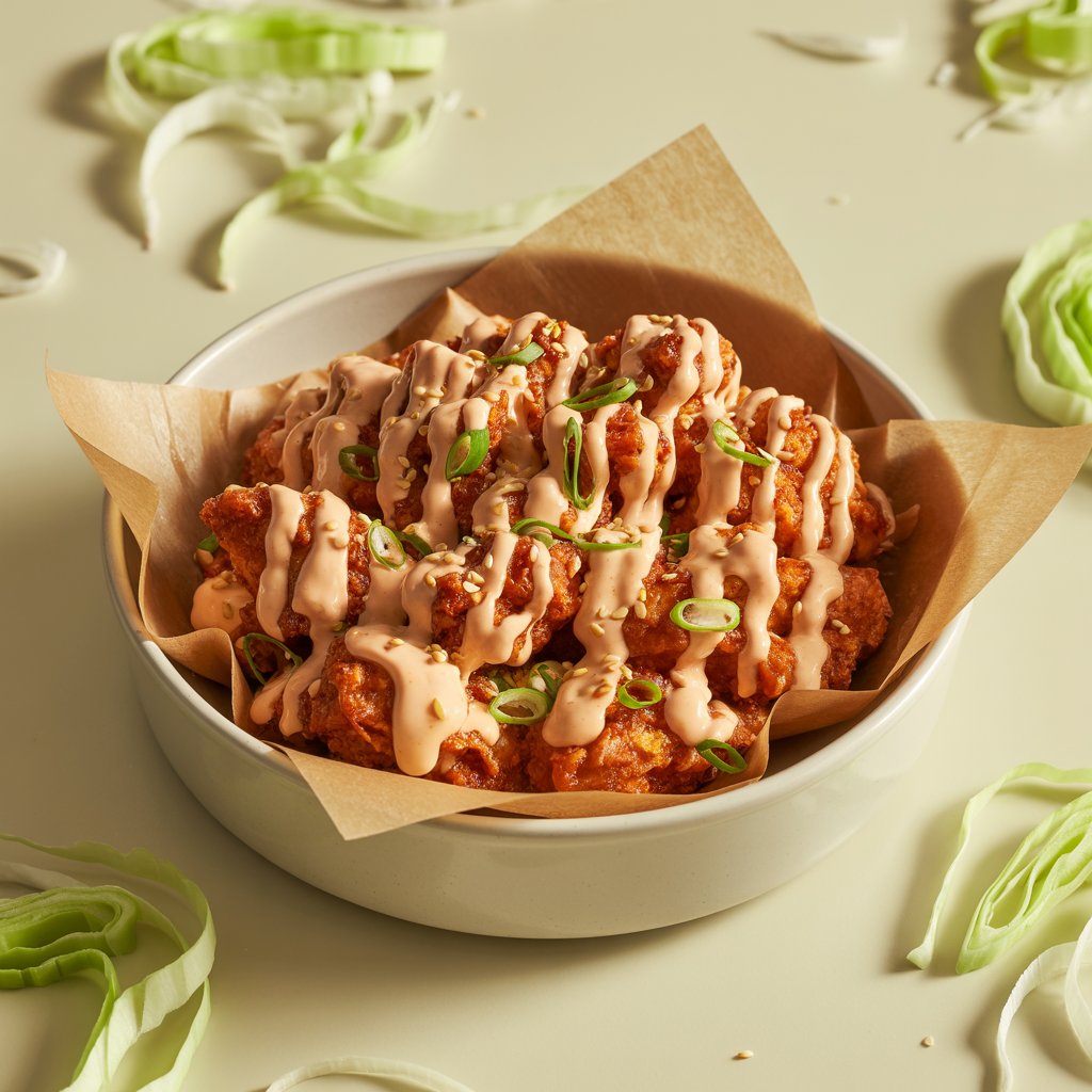 - Drizzle the bang bang sauce over the freshly fried chicken or serve on the side for dipping.
