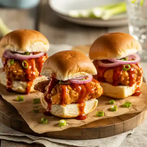 - Assemble the sliders: Layer shredded cabbage onto the bottom half of each slider bun. Add a piece of sauced chicken, another drizzle of sauce if desired, a sprinkle of chopped chives or green onions, then top with the bun. Serve while warm and crisp.