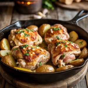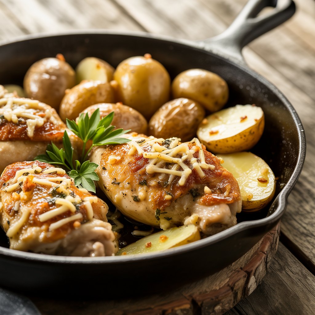 Golden, crispy roasted potatoes and tender chicken breasts infused with garlic and parmesan come together in this comforting, crowd-pleasing one-pan meal. With each bite, the rich flavors of buttery garlic and nutty parmesan coat the chicken and potatoes like a warm blanket. The crispy edges of the potatoes bring satisfying crunch, while the juicy chicken stays moist and flavorful thanks to a garlic-herb marinade that works its magic both beneath and atop the golden cheese crust.