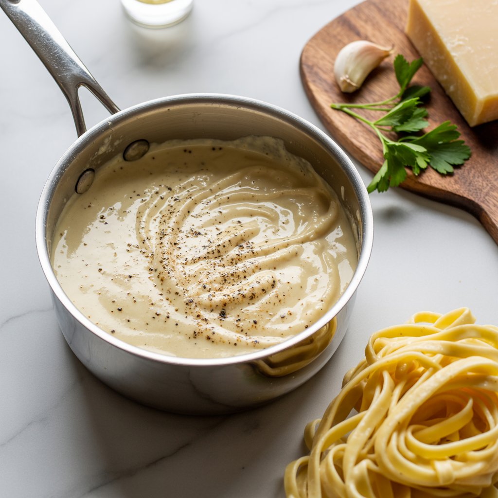 - Step 5: Slowly sprinkle in the grated Parmesan while whisking constantly. Freshly grated Parmesan is non-negotiable here — the pre-packaged kind won’t melt the same way. Keep whisking until the sauce is completely smooth and coats the back of a spoon.