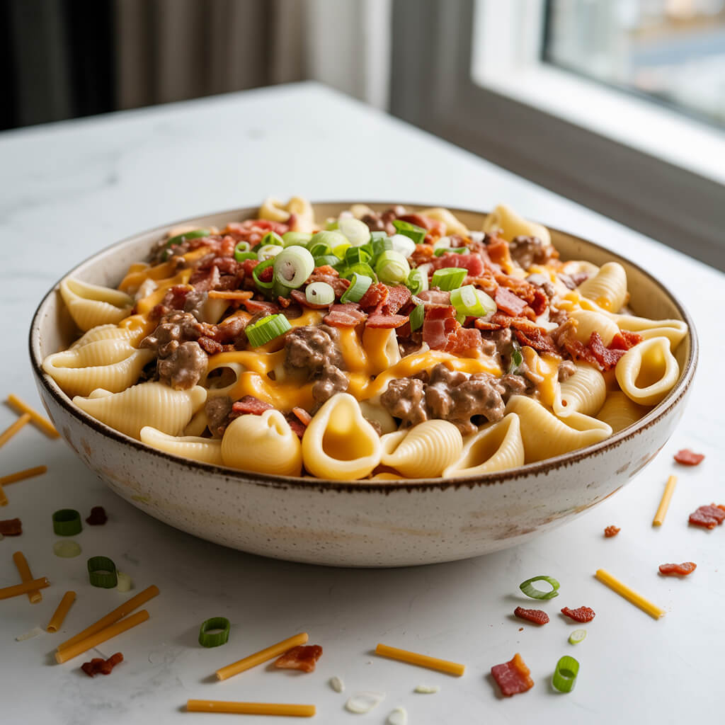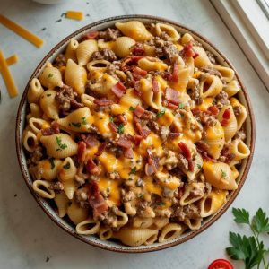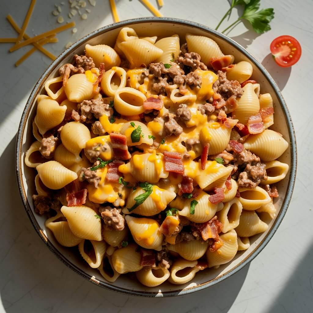 Imagine the richness of Alfredo sauce, the heartiness of a cheeseburger, and the smokiness of crispy bacon all wrapped around tender pasta. That’s exactly what this Loaded Bacon Cheeseburger Alfredo Pasta delivers.This recipe is a one-pot powerhouse of comfort food. It starts with browned ground beef and chopped bacon sizzling together, then gets hit with creamy Alfredo, sharp cheddar, and juicy tomatoes. The result? A thick, cheesy, savory sauce that hugs every noodle and tastes like a bacon cheeseburger in pasta form.Perfect for feeding a hungry family or impressing guests on a cozy night in, this meal is indulgent, easy to make, and completely unforgettable. And the best part? It comes together in under 30 minutes.
