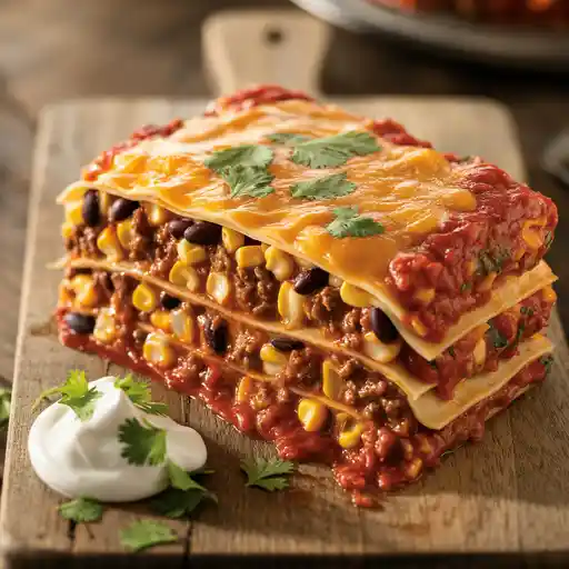 Mexican Lasagna is best served hot right out of the oven, garnished with chopped cilantro, sliced green onions, or a dollop of sour cream. Pair it with a fresh green salad or scoop of guacamole for a balanced meal.