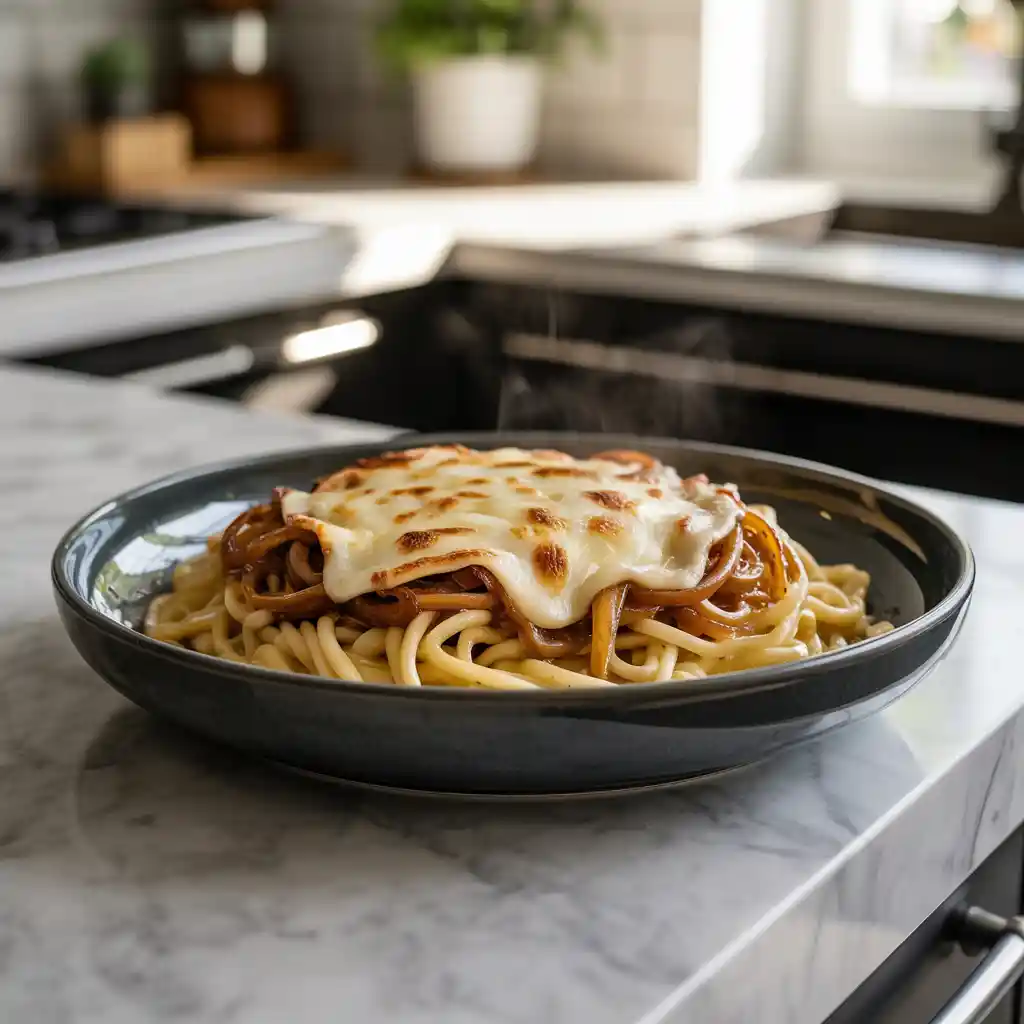 As the onions slowly caramelize, they release their natural sweetness and fill your kitchen with a deep, buttery aroma that stirs up memories of Sunday suppers and chilly evenings. The pasta cooks directly in the broth with all those golden onions, absorbing every ounce of flavor. Finished with a touch of cream and a sprinkle of melty Gruyère cheese, each forkful is reminiscent of the bubbling top of a French onion crock — perfectly golden and undeniably satisfying.