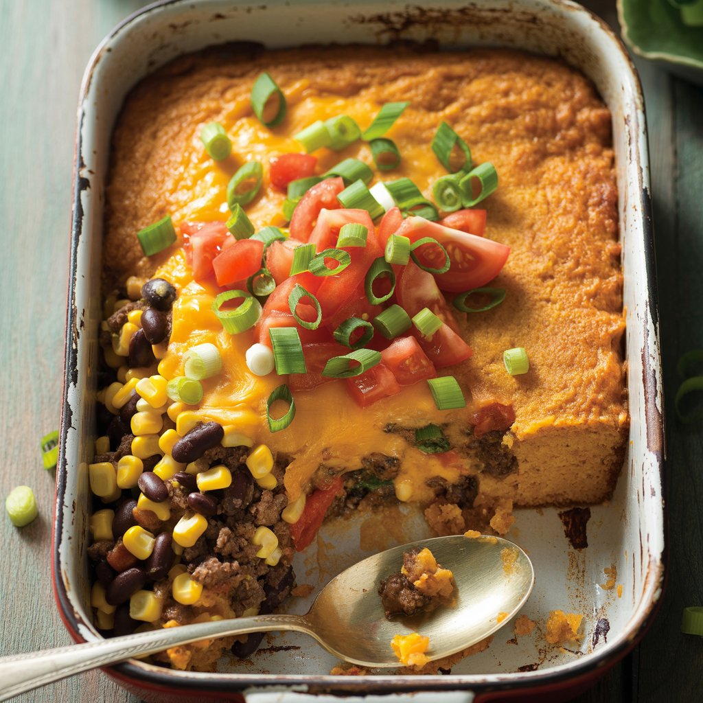 Dinner, Mexican-American, casserole, taco casserole, cornbread taco bake, one-pan meal