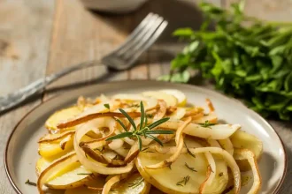 - Remove the patties and set them aside. In the same skillet, add the sliced onion. Sauté until soft and golden, about 5 to 7 minutes, scraping up any brown bits — that’s where the deep flavor comes from.