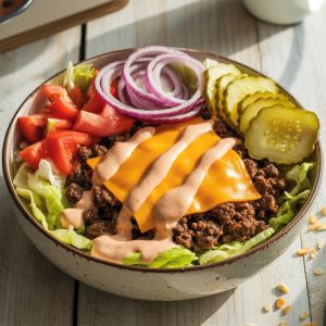Imagine all the bold and savory satisfaction of your favorite backyard cheeseburger — juicy seasoned beef, melty cheese, crisp lettuce, and mouthwatering toppings — reimagined in a fresh and vibrant way. Cheeseburger bowls bring together everything you love about the classic American burger but in a lighter and more customizable format. Each bite balances the richness of grilled meat with the cool crunch of vegetables, the creaminess of dressing, and the familiar tang of pickles and mustard.