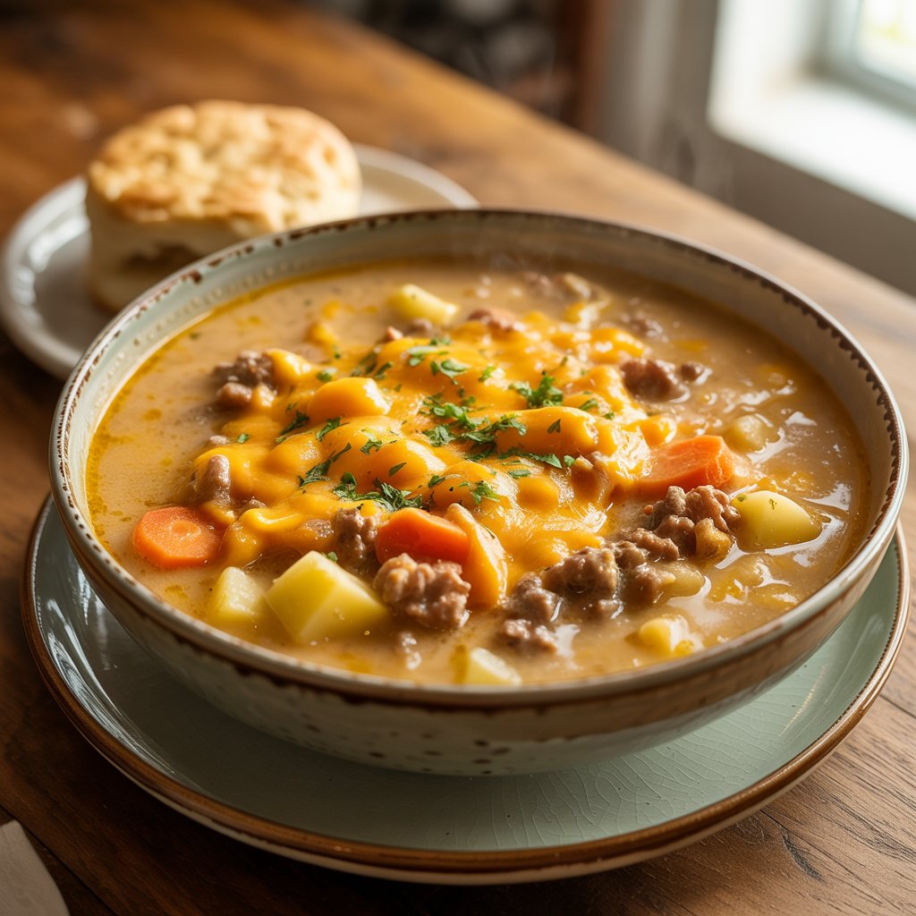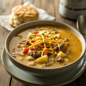 Imagine wrapping yourself in a cozy blanket on a chilly evening — that is exactly what a bowl of cheesy hamburger potato soup feels like. This hearty and comforting dish combines the rich flavor of ground beef with tender chunks of potato, all immersed in a velvety blanket of cheddar cheese. It is like your favorite cheeseburger and rustic potato soup met in a warm embrace. Each bite delivers the boldness of seasoned beef, the earthiness of potatoes, and the gentle pull of melted cheese.