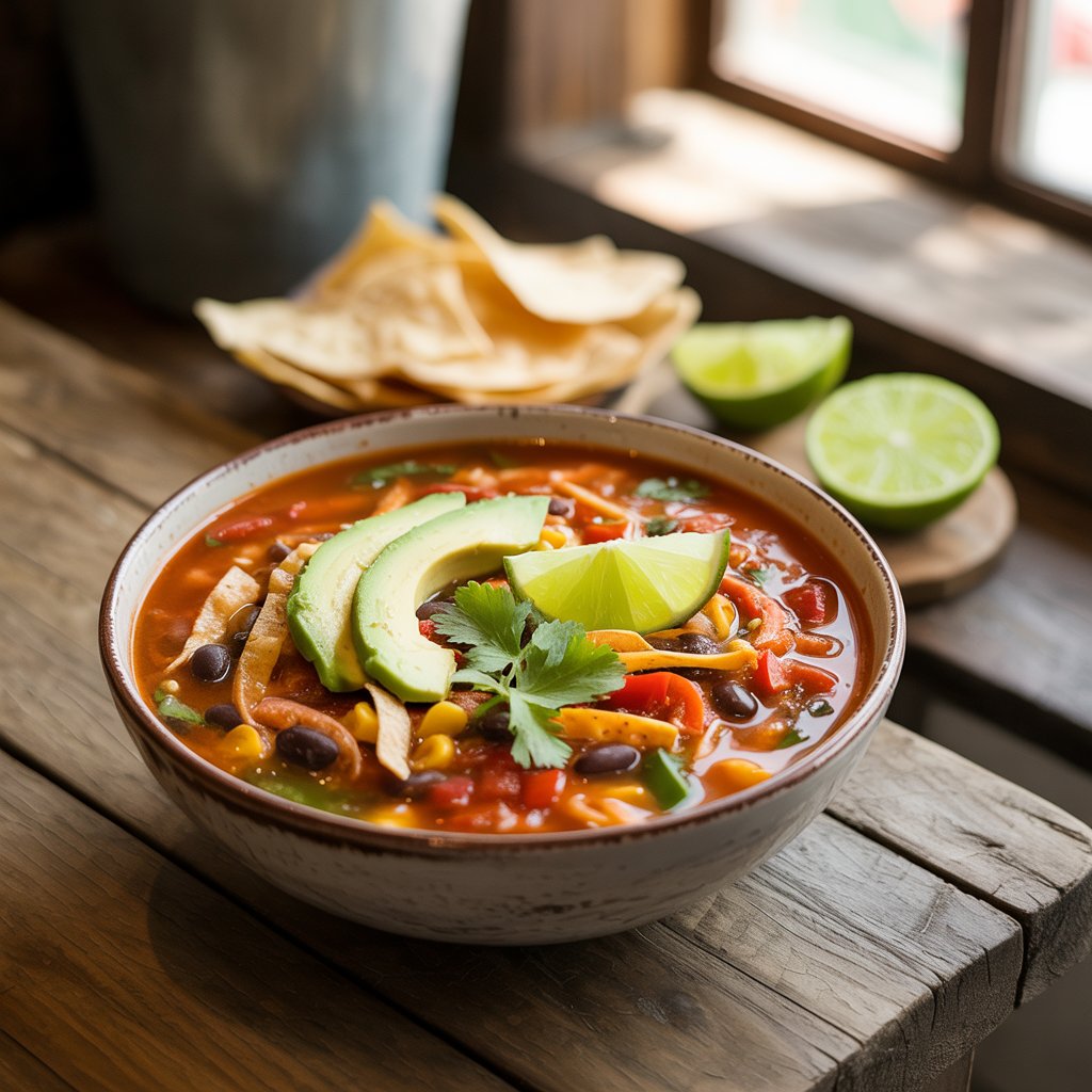 With every spoonful, you’ll discover layers of texture and flavor: fire-roasted tomatoes lend a gentle smokiness, black beans and corn give sweet, earthy notes, and the spices bring just the right whisper of warmth. Topped with crunchy tortilla strips, creamy avocado, tangy lime, and a sprinkle of fresh cilantro or shredded cheese, this soup feels like a warm hug wrapped in sunshine. It is comforting, filling, and just the right kind of spicy.