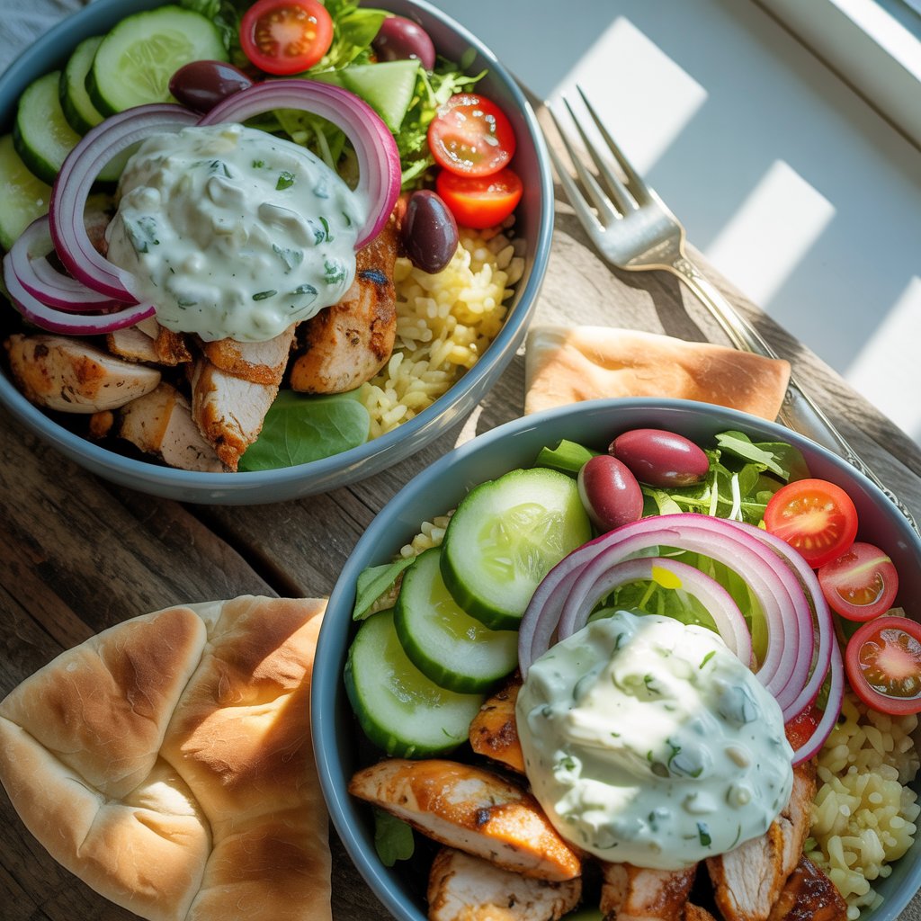 - Assemble the bowls: Divide the rice or quinoa into four bowls. Arrange sliced chicken on top, then layer in cherry tomatoes, cucumbers, red onions, olives, and feta cheese.