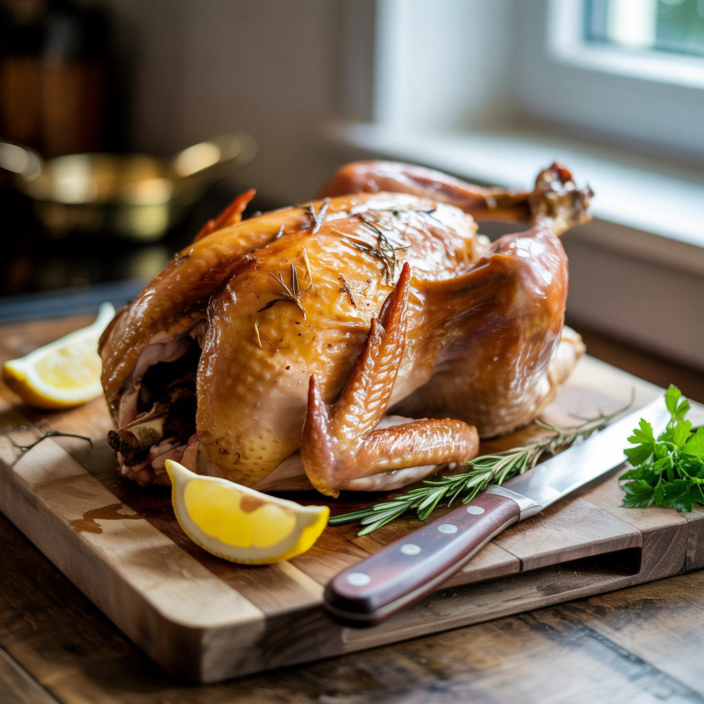 - Stuff the cavity with halved lemon, smashed garlic cloves, and fresh rosemary sprigs.