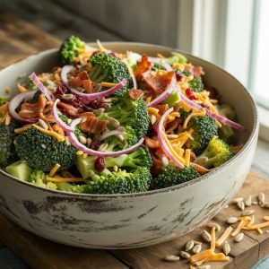 Crisp, colorful, and bursting with flavor, this broccoli salad tastes like summer sunshine in a bowl. Each bite brings together tender-crunchy broccoli florets, smoky bacon, sweet red onion, juicy raisins, and the creamy tang of a homemade dressing. It’s the kind of dish that makes you linger at the picnic table just a little longer, savoring the way the sweet and savory elements dance together like old friends at a backyard barbecue.
