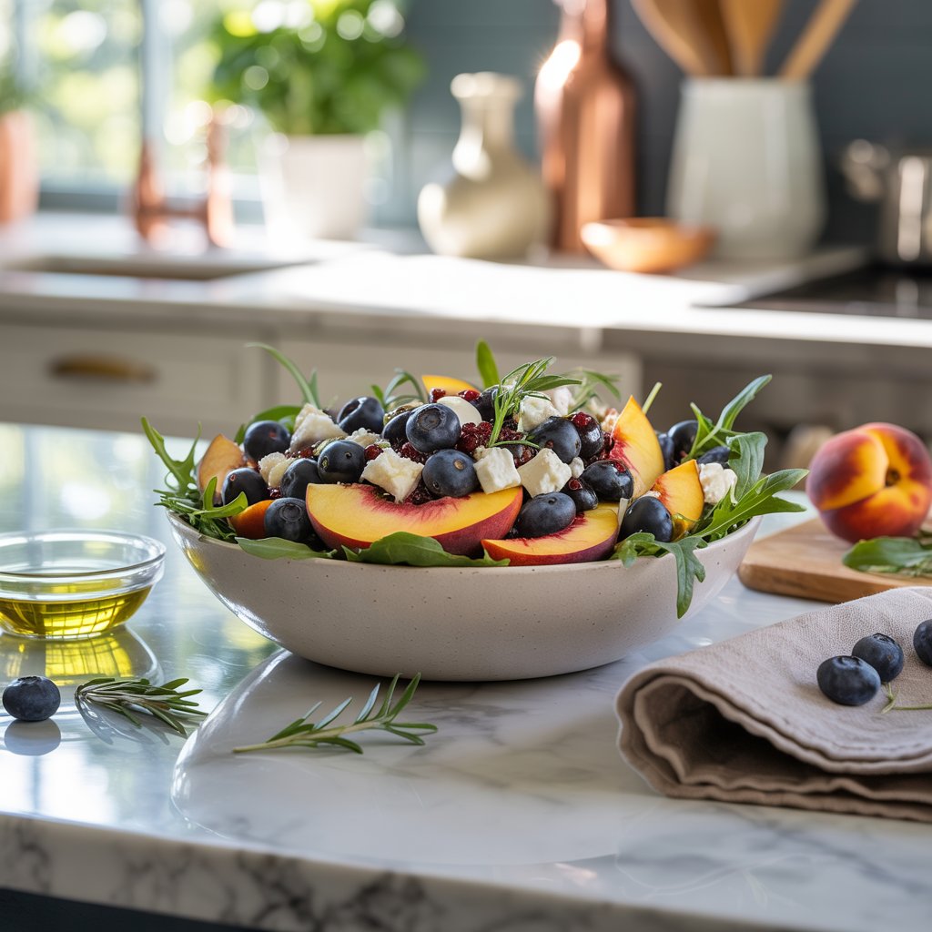 Serve this salad immediately after assembling for the best texture. If you are planning ahead, prep the ingredients separately. Slice the peaches, wash the blueberries, crumble the feta, and refrigerate each part. Mix the vinaigrette and store it in a small airtight jar. Then just toss everything together before serving.