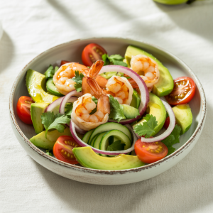The creamy avocado plays the perfect partner to the shrimp, offering a mellow balance to the citrusy punch of the dressing. Sweet cherry tomatoes, crunchy cucumber, and thin red onion slices add layers of freshness, while cilantro adds an herbal lift that evokes the charm of sun-drenched coastal cuisine. Whether served as a light lunch or a dinner appetizer, this salad is the kind of dish that satisfies without weighing you down.